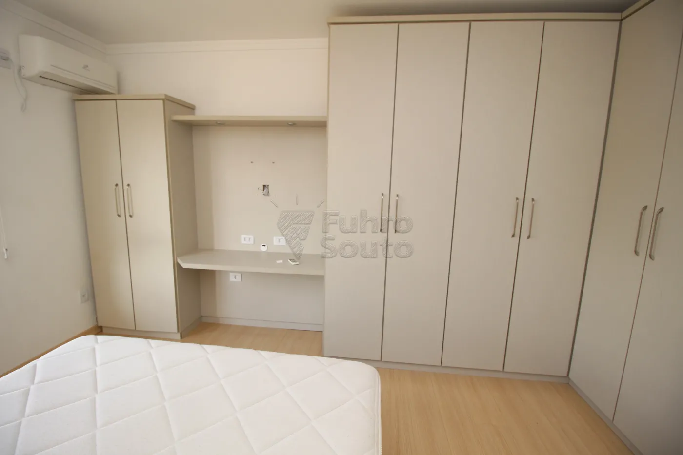 - Dormitório Confortável: Quarto com piso laminado, cama box casal, cabeceira, ar-condicionado e guarda-roupa planejado, garantindo um espaço de descanso aconchegante e organizado.