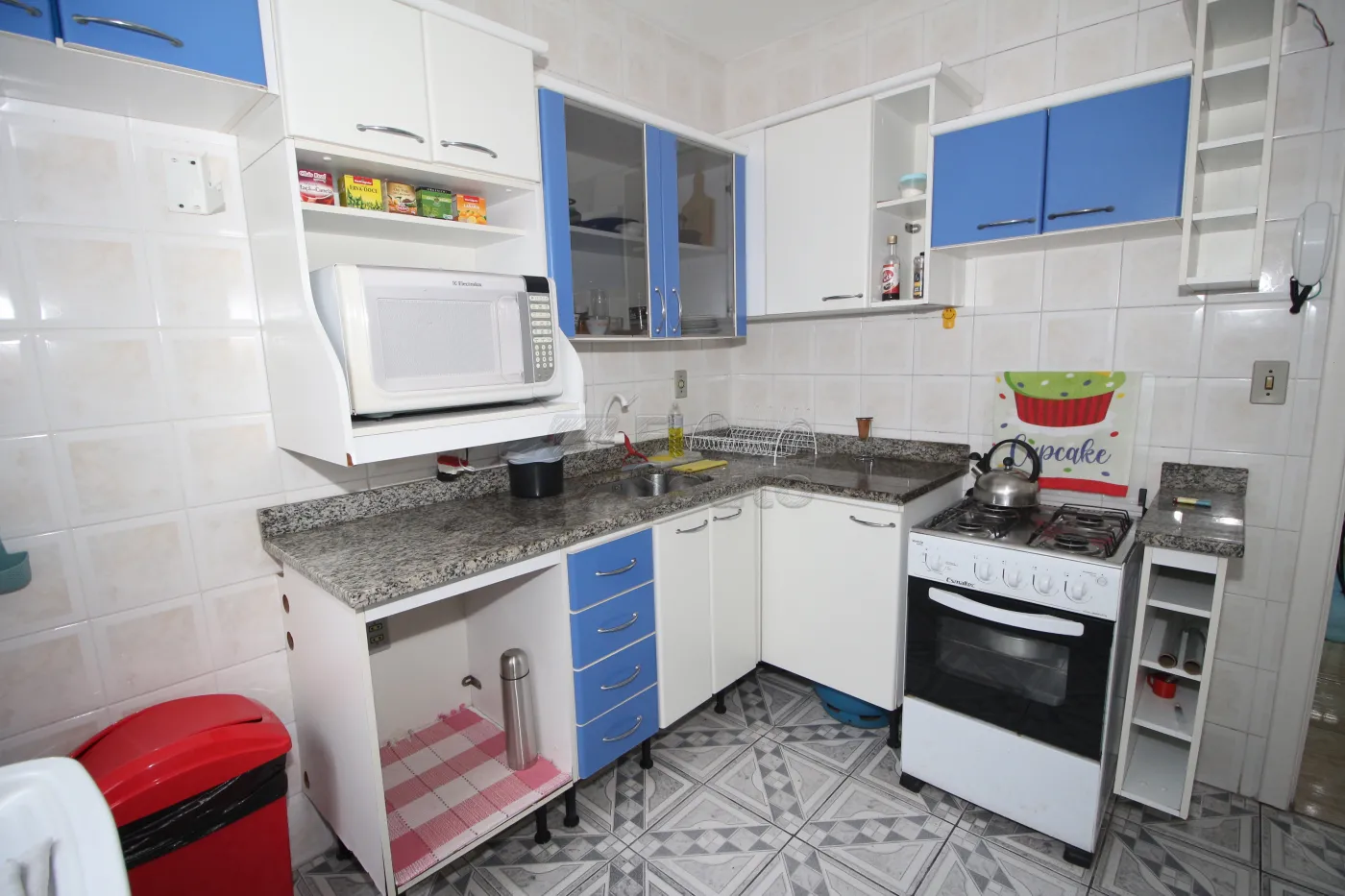 - Cozinha Completa: Totalmente mobiliada com balcão de pia, armários, geladeira, fogão, micro-ondas e área de serviço integrada.