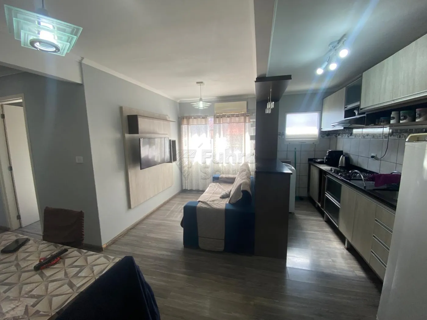 Sala e cozinha conjugadas : Ambiente funcional e bem decorado. A sala possui painel e TV, sofá, armário planejado e mesa com 4 cadeiras.