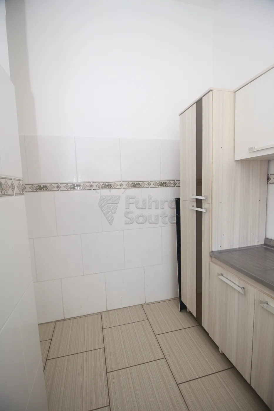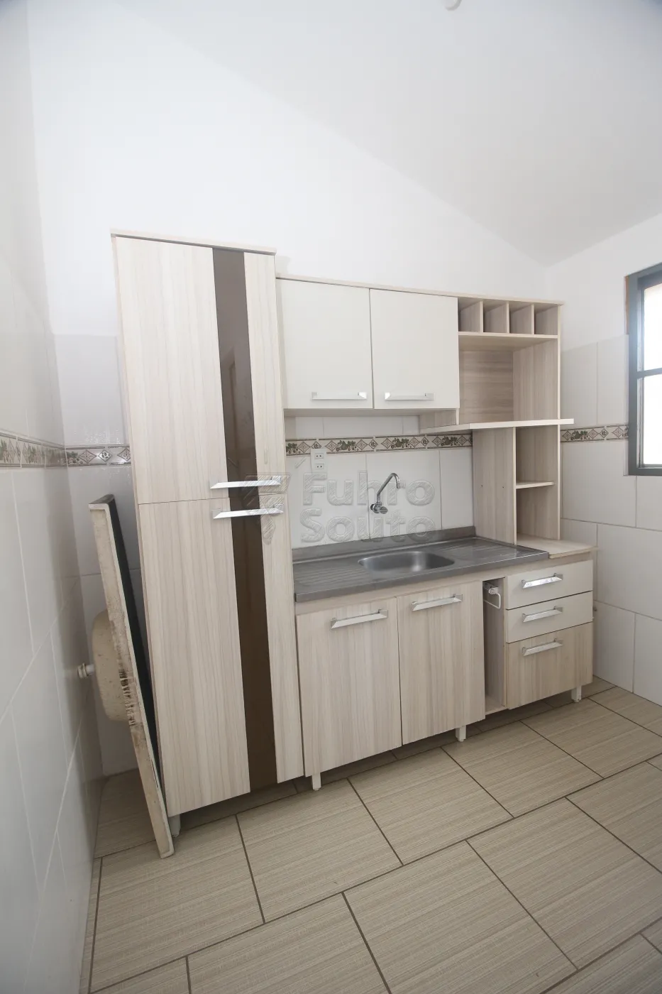 - Cozinha funcional, com espaço para armários e área para refeições.