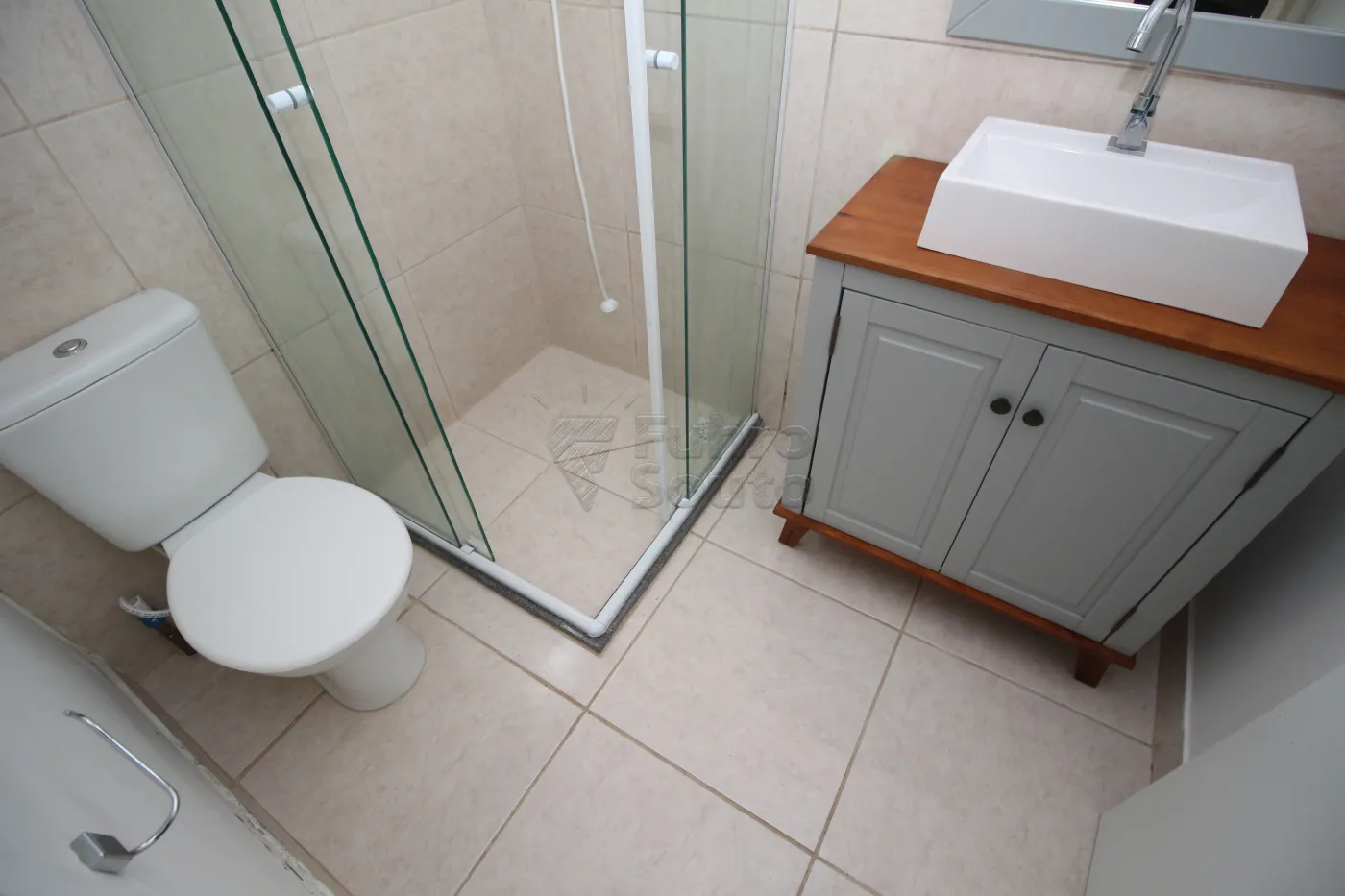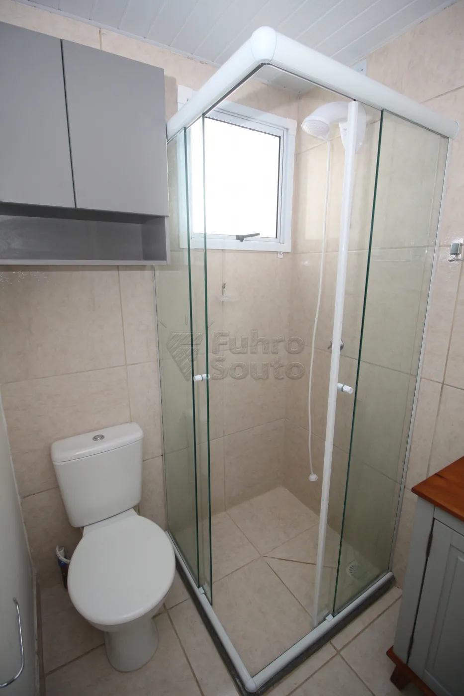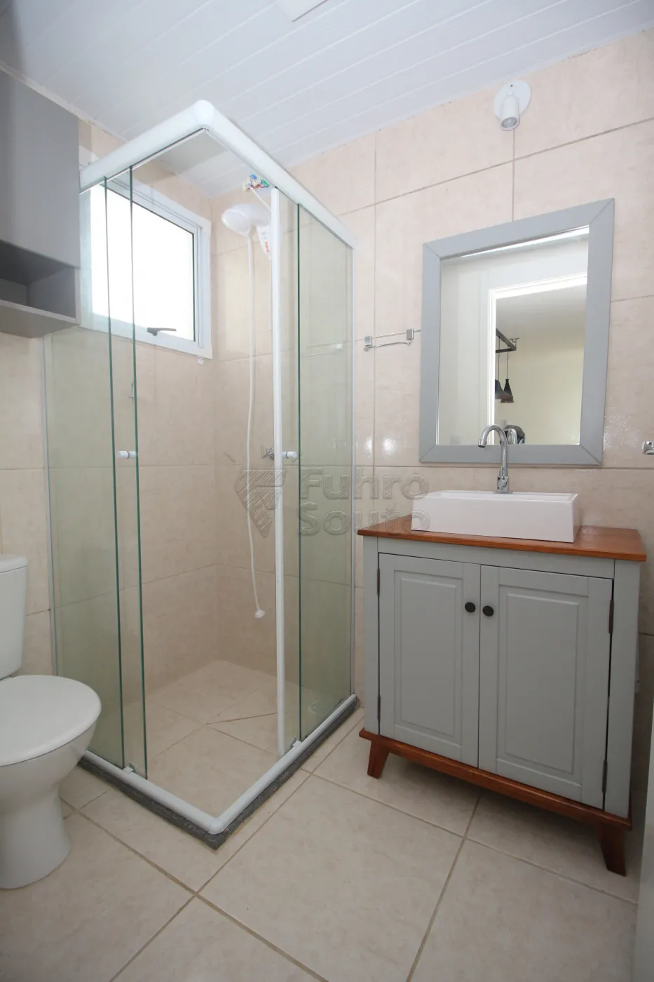 Banheiro completo com box de vidro e armário com cuba, garantindo comodidade e praticidade.