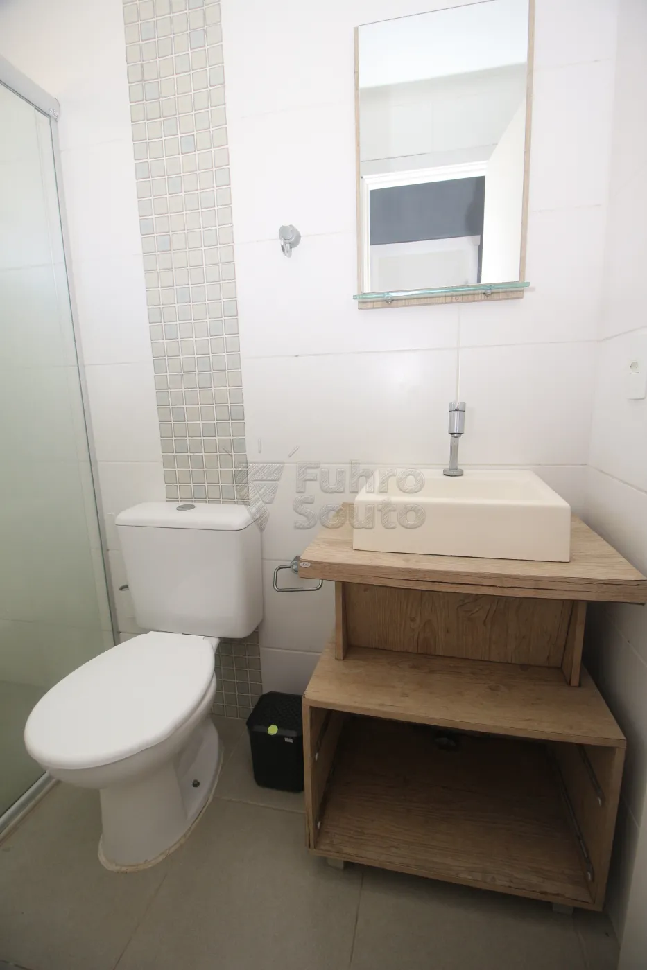 Banheiro Social funcional com box de vidro e armário com cuba e espelho.