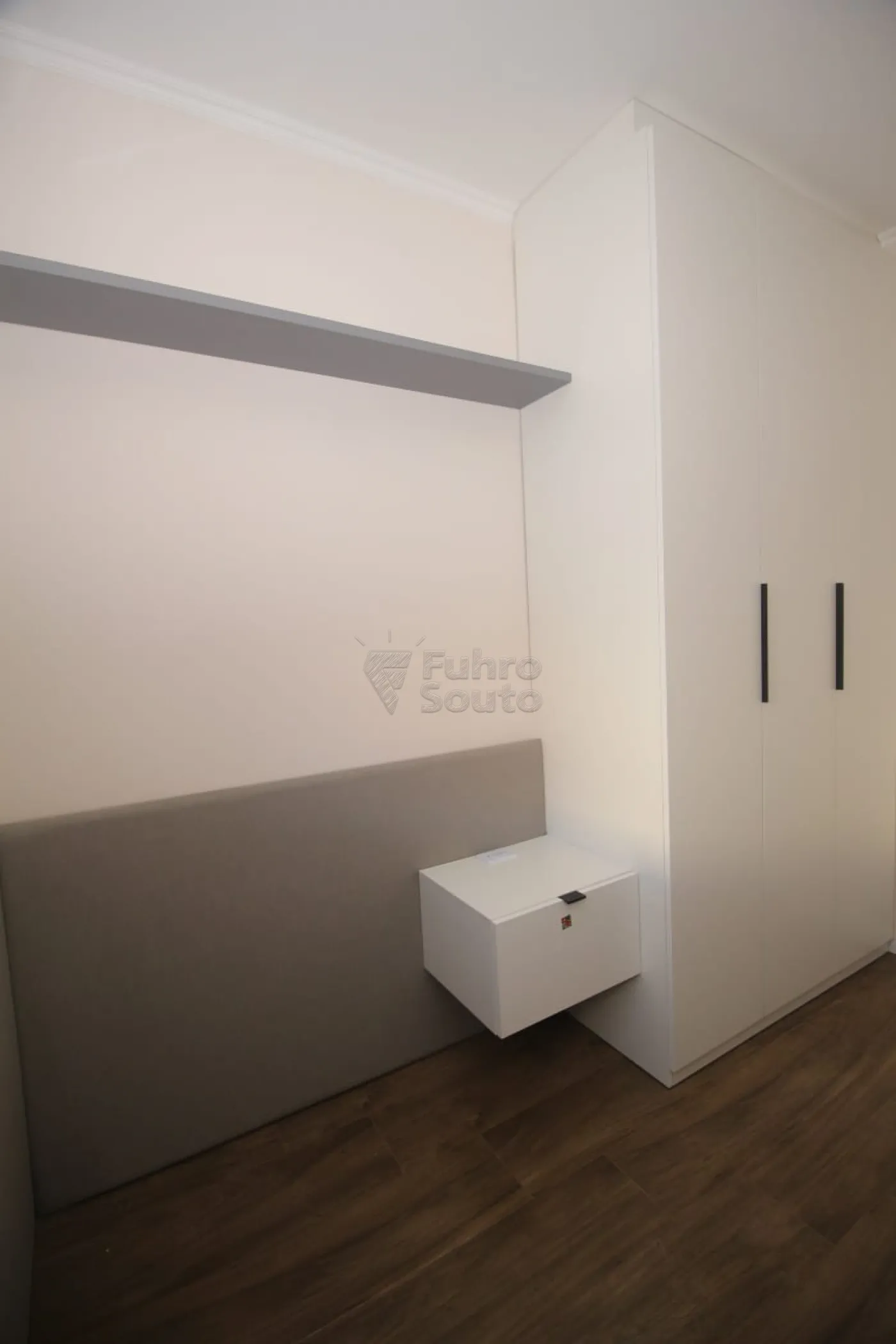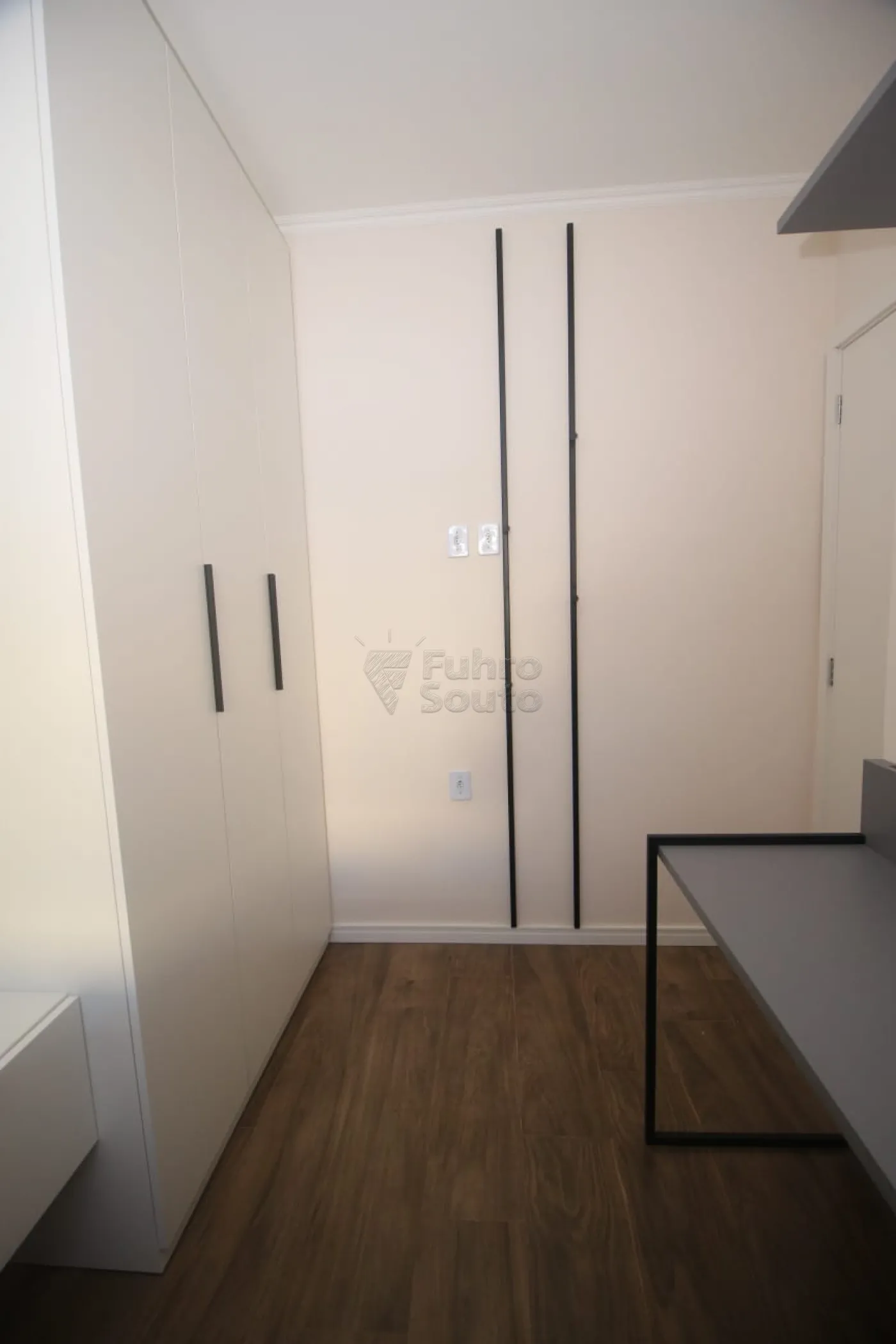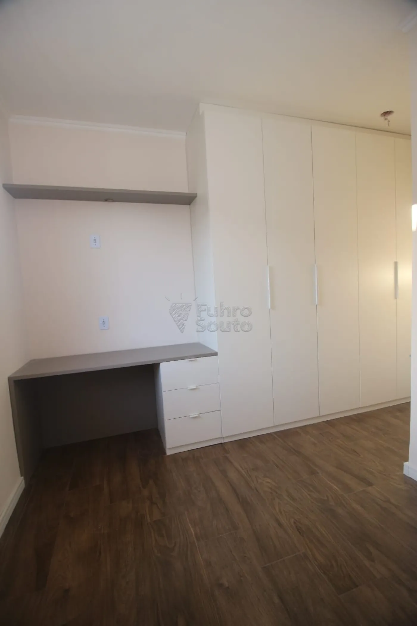 Quarto 1: equipado com roupeiro planejado, cabeceira de cama e mesa para estudos, ideal para um ambiente funcional e organizado.
