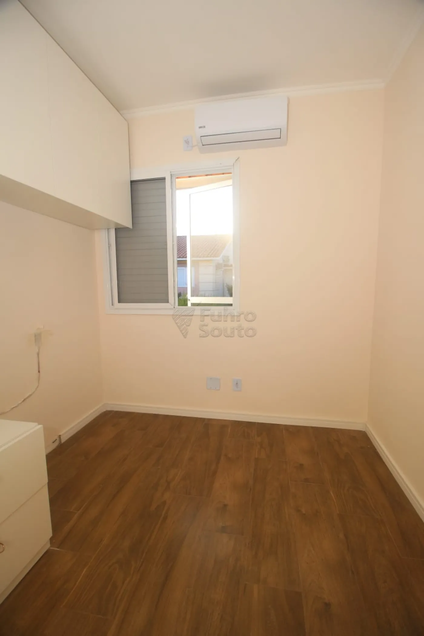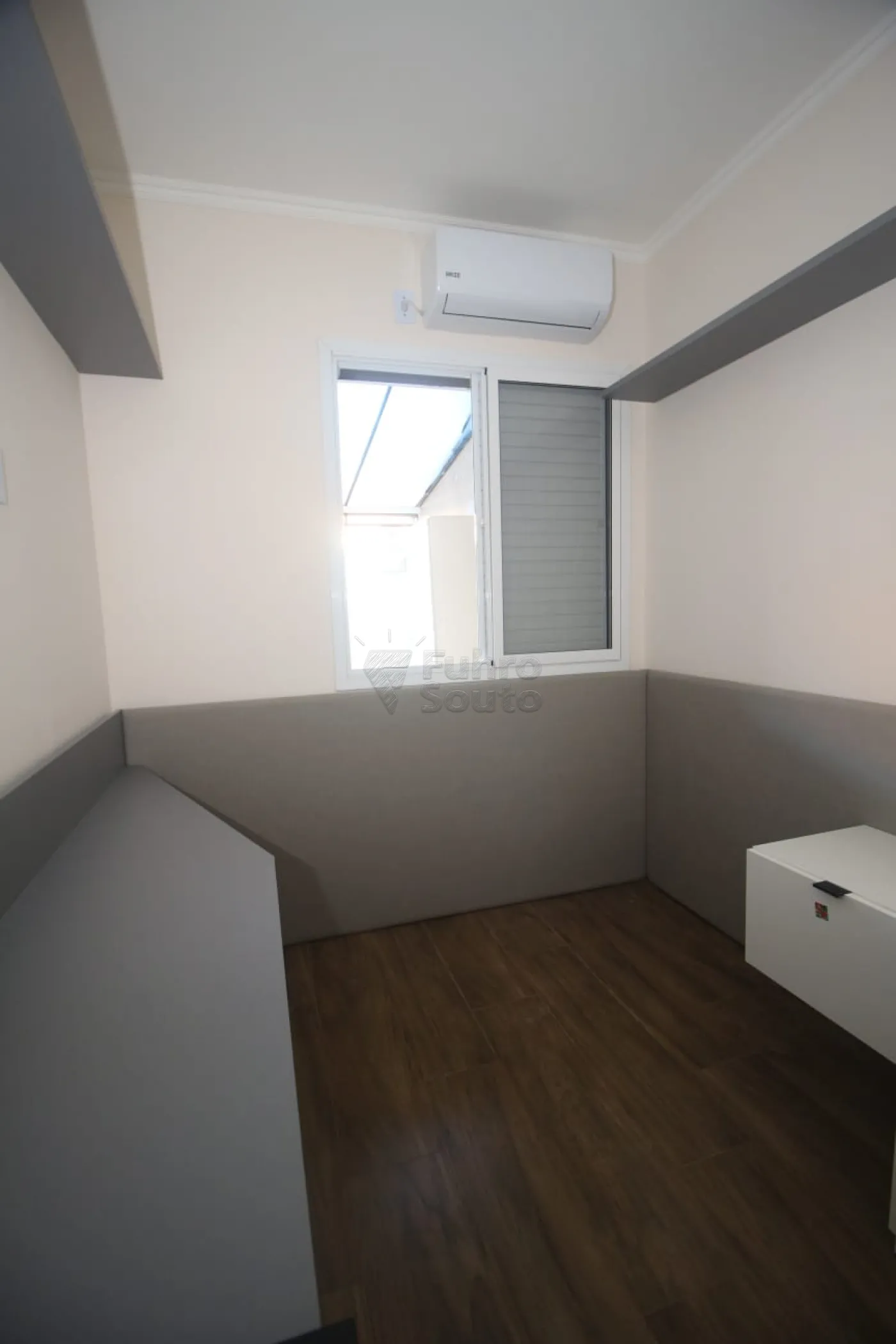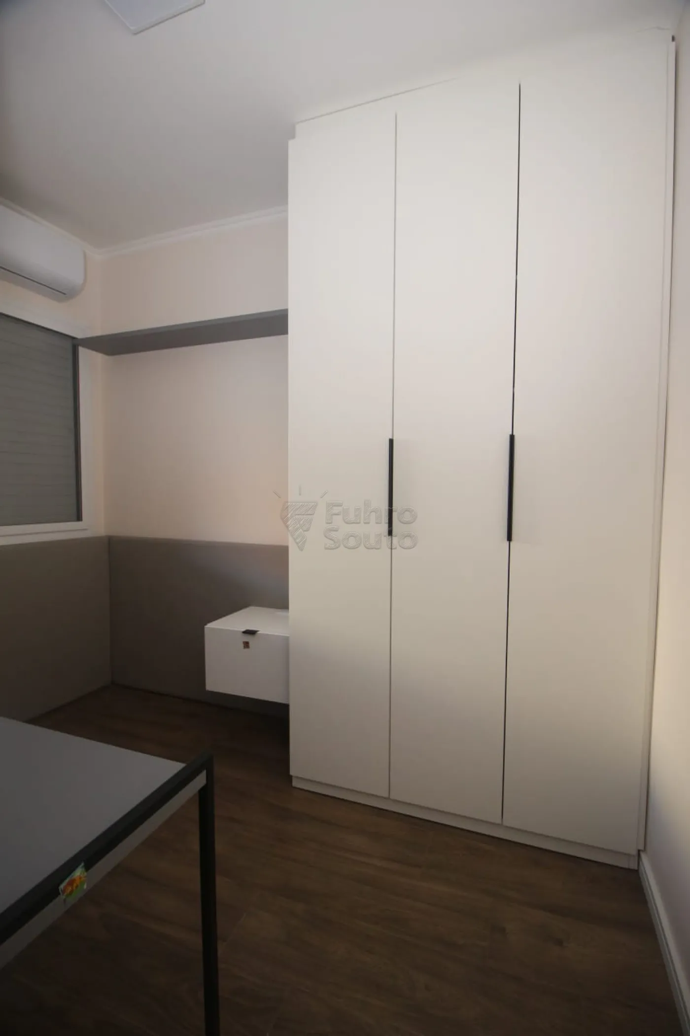 Quarto 1: equipado com roupeiro planejado, cabeceira de cama e mesa para estudos, ideal para um ambiente funcional e organizado.