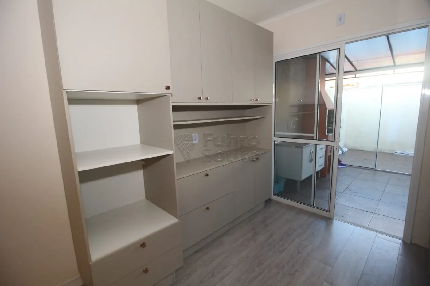 Separação da área externa com o pátio através de portas de vidro, permitindo entrada de luz natural e maior aproveitamento visual dos ambientes.