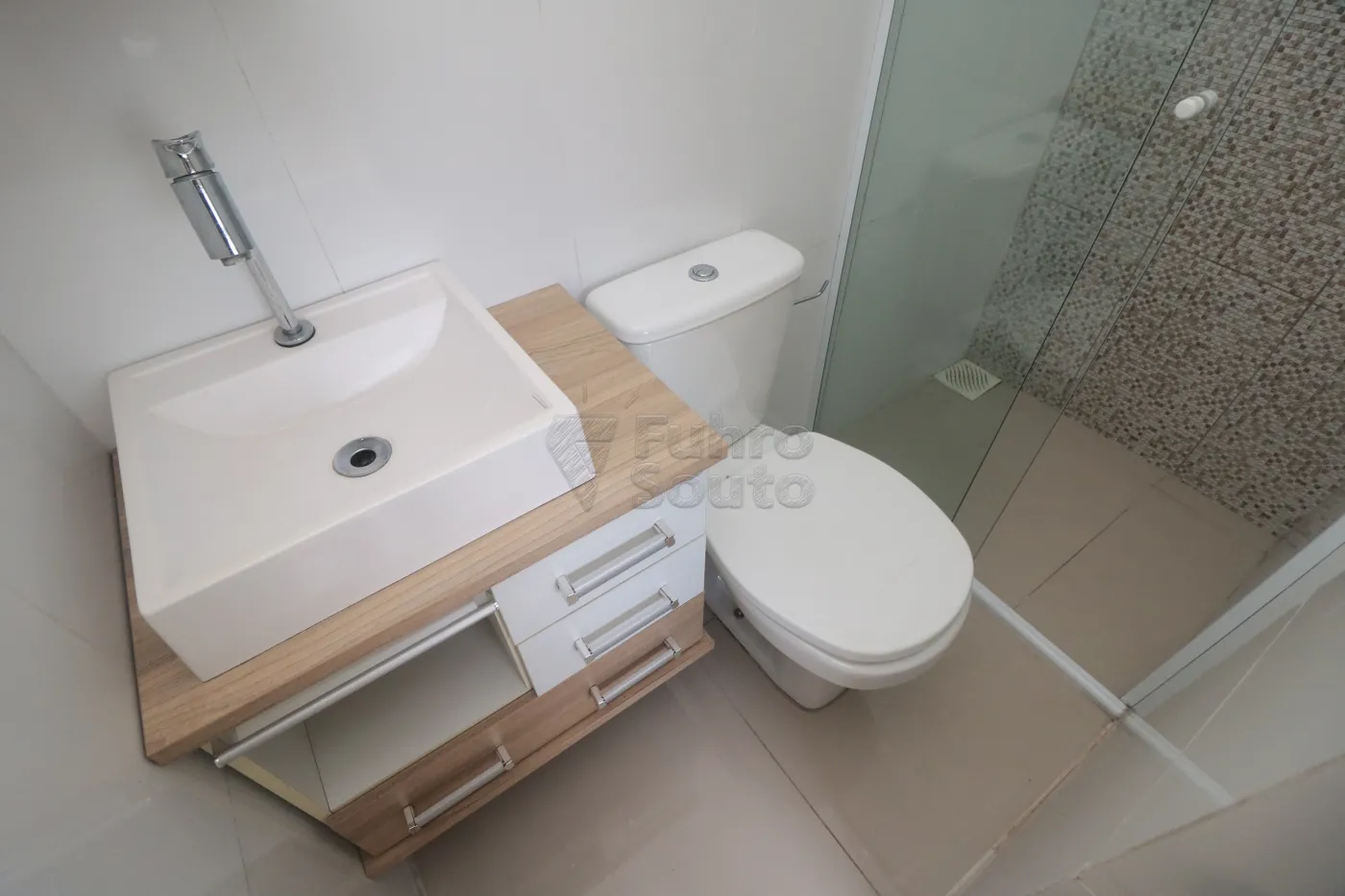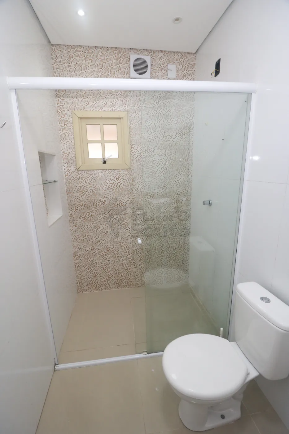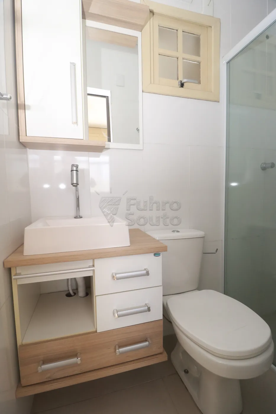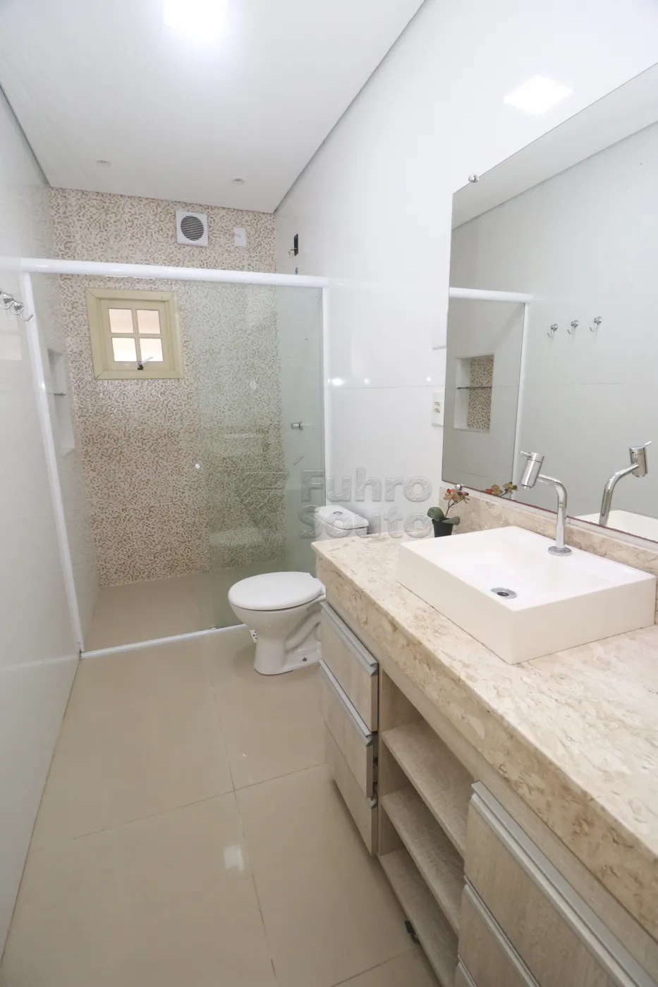 Banheiro amplo com armário planejado, espelho e box de vidro, trazendo praticidade ao dia a dia.