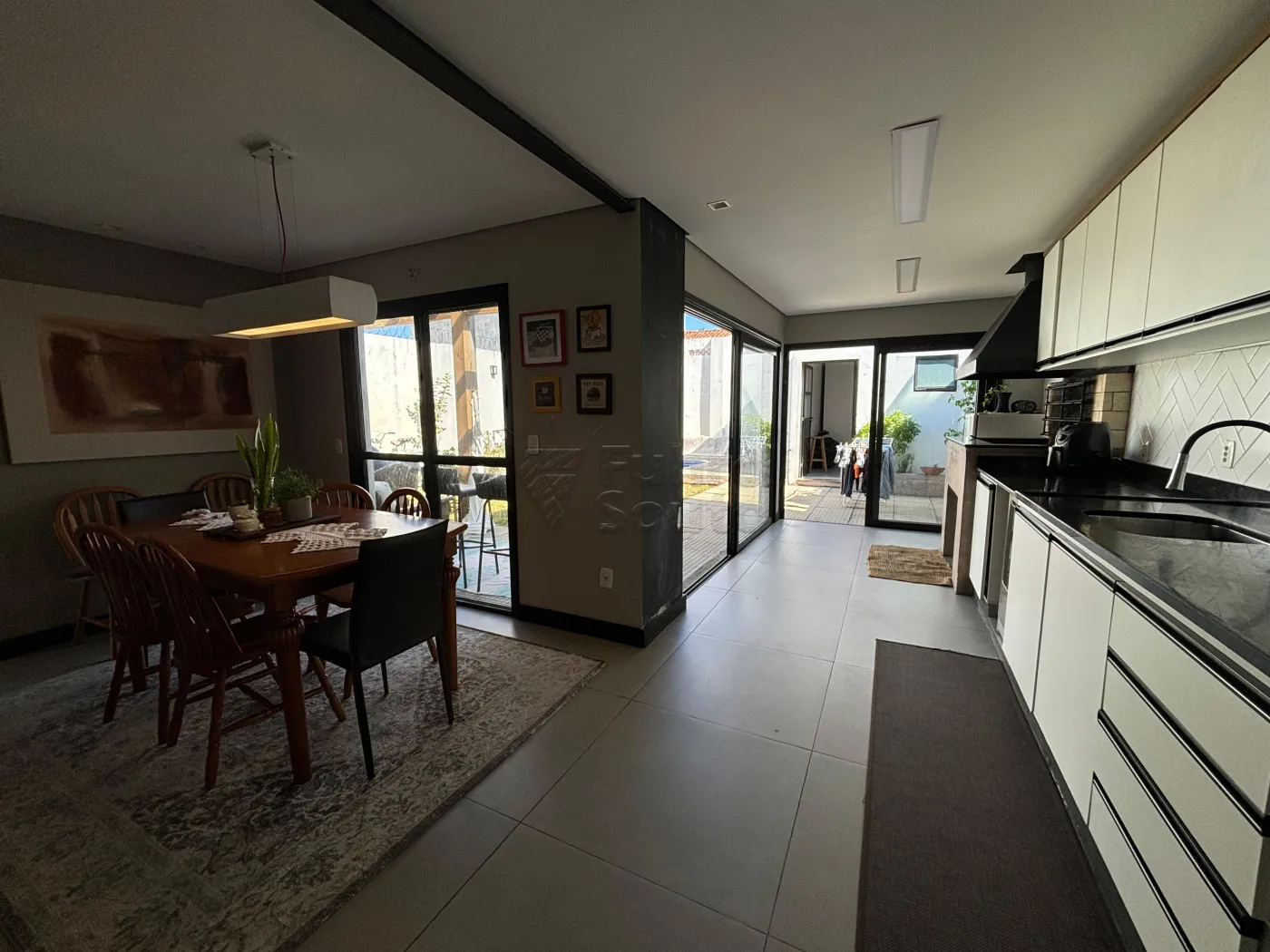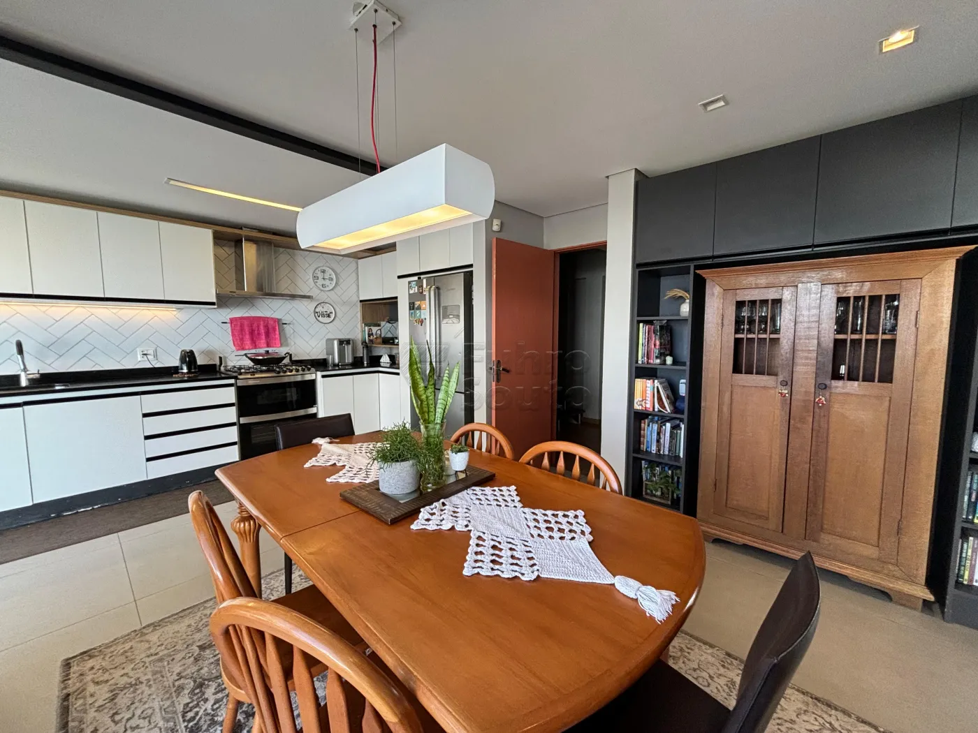 Sala de jantar integrada à cozinha em conceito aberto, criando um ambiente perfeito para convívio e refeições em família.