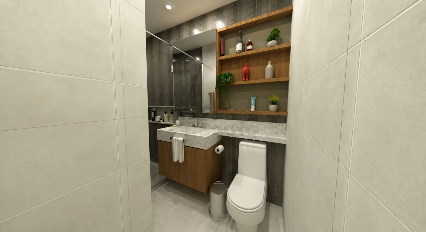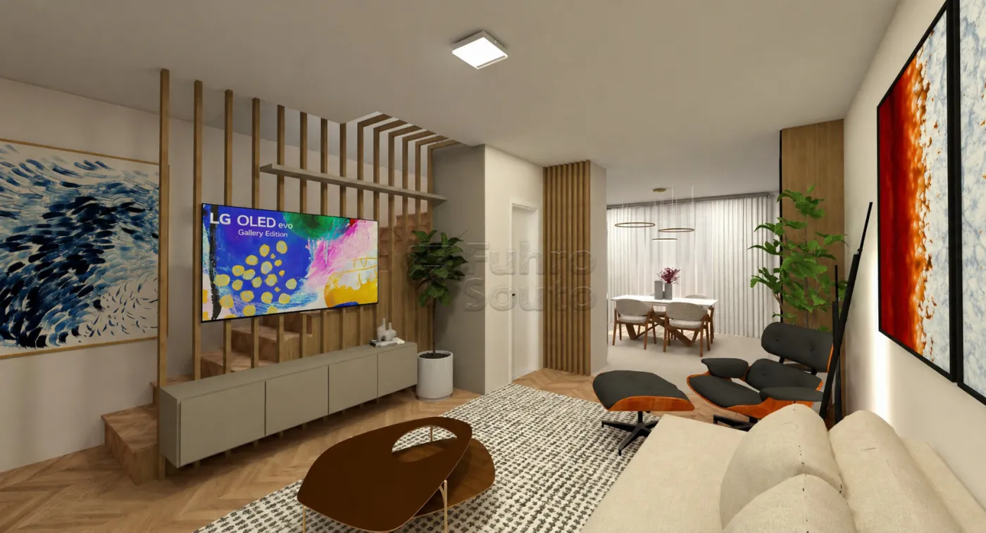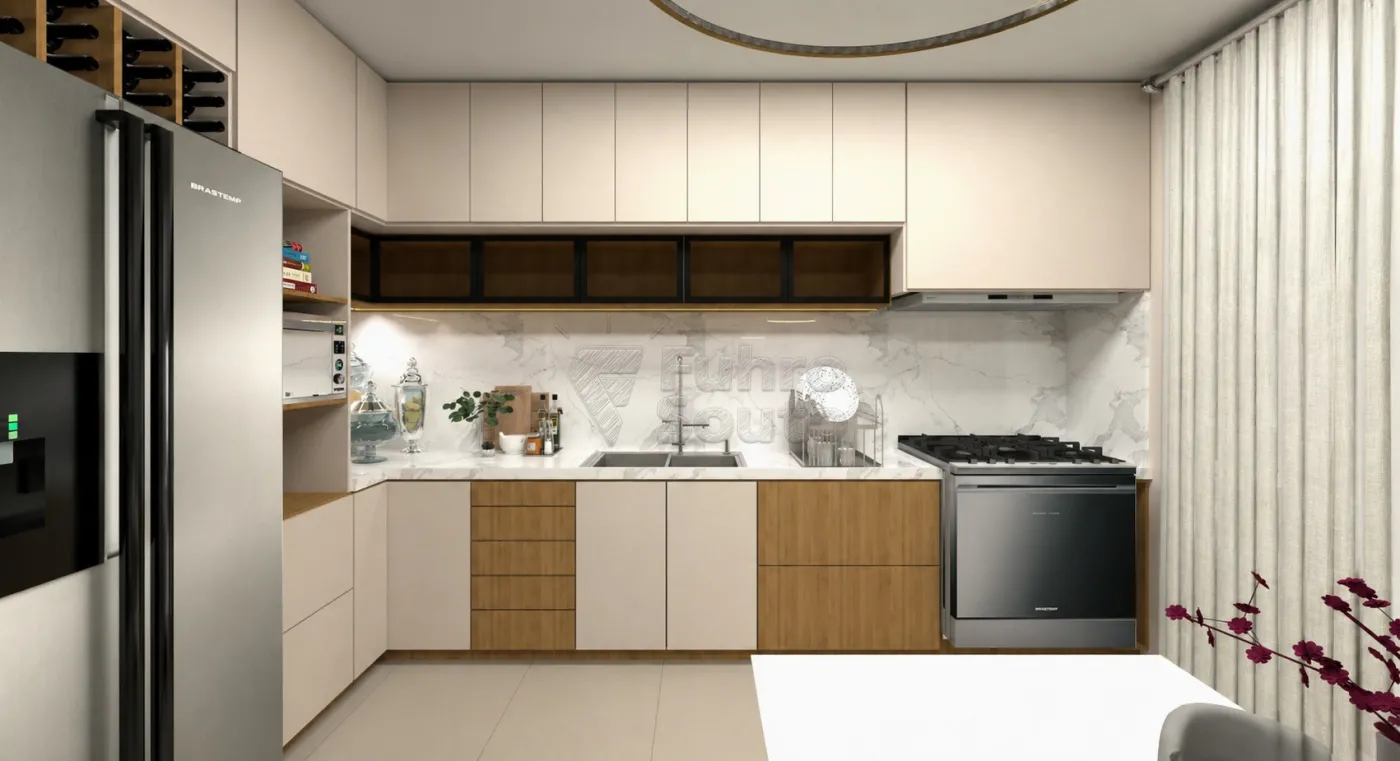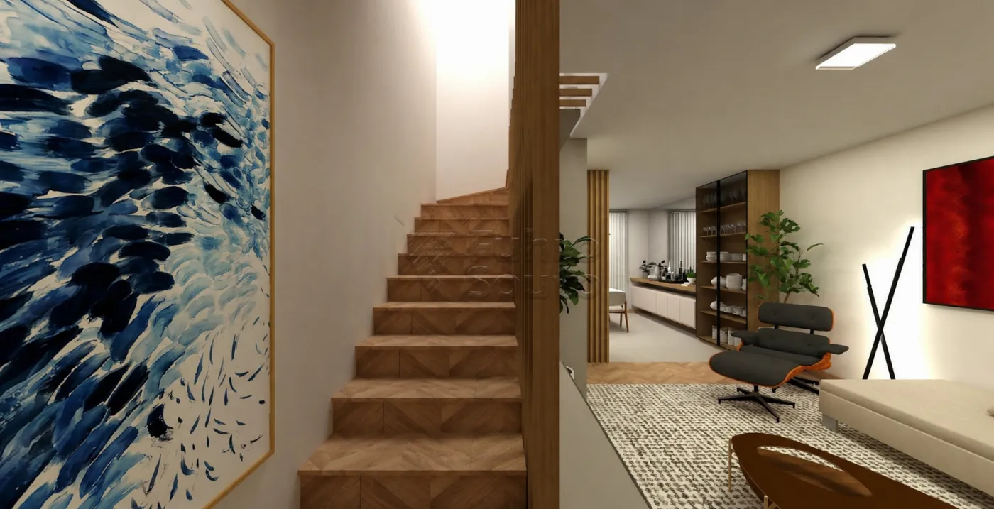 O imóvel possui, no pavimento térreo, sala de estar integrada à cozinha americana, lavabo e acesso ao pátio nos fundos, que conta com espaço gourmet e churrasqueira.