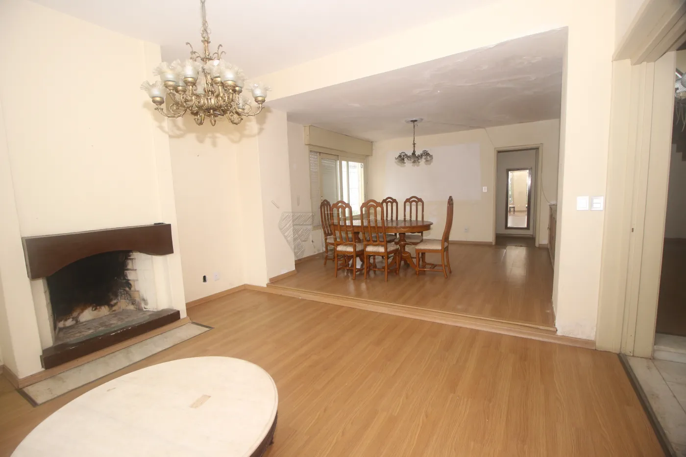 Sala de estar e jantar com lareira.